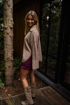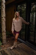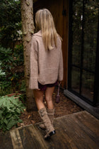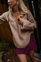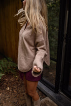 The Beige Jada Sweater features a flattering V-neck with a cuffed collar, side hem cutouts, and a slightly loose silhouette for effortless comfort. Crafted from a soft fabric, it’s perfect for adding a relaxed yet refined touch to your everyday style.