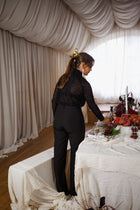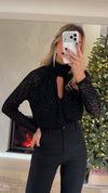 Bold and sophisticated, the Black Leopard Julia Bodysuit features a high collar and luxurious black velvet with tonal leopard print. With a keyhole opening at the bust, unlined sleeves and back, and slight transparency, it combines allure with modern style. Snap closure at the bottom ensures a comfortable, secure fit.