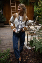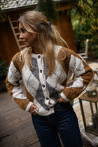 Wrap yourself in the cozy charm of the Brown Checkered Diaz Cardigan. Designed with a round neckline and button-down front, it features a soft, slightly thick knit that keeps you warm. The grey, white, and brown jacquard pattern adds a subtle touch of texture and style — perfect for everyday wear.