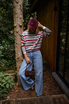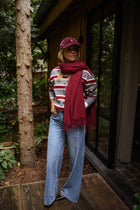 - Our models are also wearing the Blue Guetta Jeans and the Burgundy Ronald Scarf