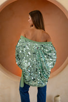 Shine bright in the Green Hannah Cardigan, crafted in Italy with sequins that catch every light. Featuring long sleeves, a wrap effect, and a tie fastening, this slightly loose-fitting cardigan combines glamour with effortless comfort—perfect for layering over day or evening outfits.