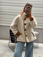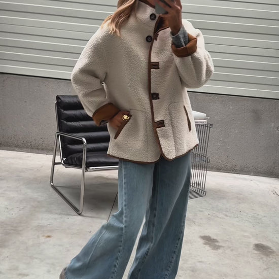 Wrap yourself in warmth with the Camel Shearling Ninho Coat. This reversible design combines soft ecru sheepskin on one side and smooth camel suede on the other, offering two stylish looks in one. Featuring a high collar, button placket, and side pockets, it’s the ultimate blend of comfort and sophistication.