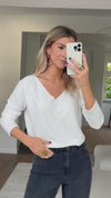 - Ecru long sleeve sweater that has a beautiful v-neckline and is super soft and cozy. This sweater is the perfect 'not-so-basic-basic' to have as a part of your wardrobe collection to dress up or down all year round.
