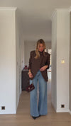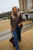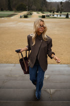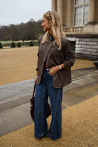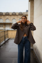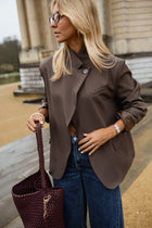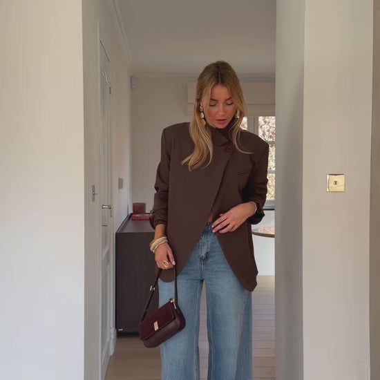 Sharp tailoring meets a modern twist in the Brown Doris Blazer, designed with an asymmetrical front that sets it apart from classic silhouettes. Featuring buttons that fasten both inside and outside, it creates a structured, secure fit, enhanced by defined shoulder pads for a confident shape. Fully lined and finished with long sleeves, the Brown Doris Blazer brings a bold yet polished edge to any outfit.