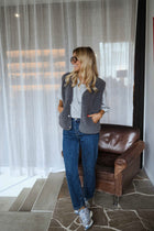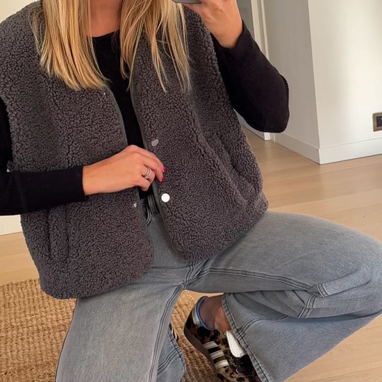 Stay cozy and stylish with the Gray Taoh Vest. Featuring a soft, shearling-effect texture, this sleeveless piece adds a touch of warmth and charm to any outfit. Its slightly cropped and loose fit creates a modern silhouette, complete with front pockets for a laid-back yet chic finish.