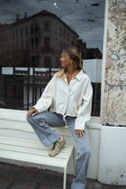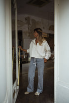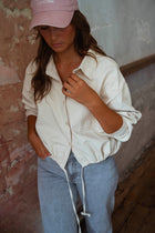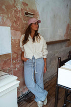 Redefine casual denim with the Beige Denim Hanae Shirt. Designed with long sleeves, a button-up silhouette, and two front pockets, it’s elevated by a lace tie at the hem and a slightly cropped fit. Effortless yet stylish, it’s the perfect piece to pair with high-waisted jeans or skirts.