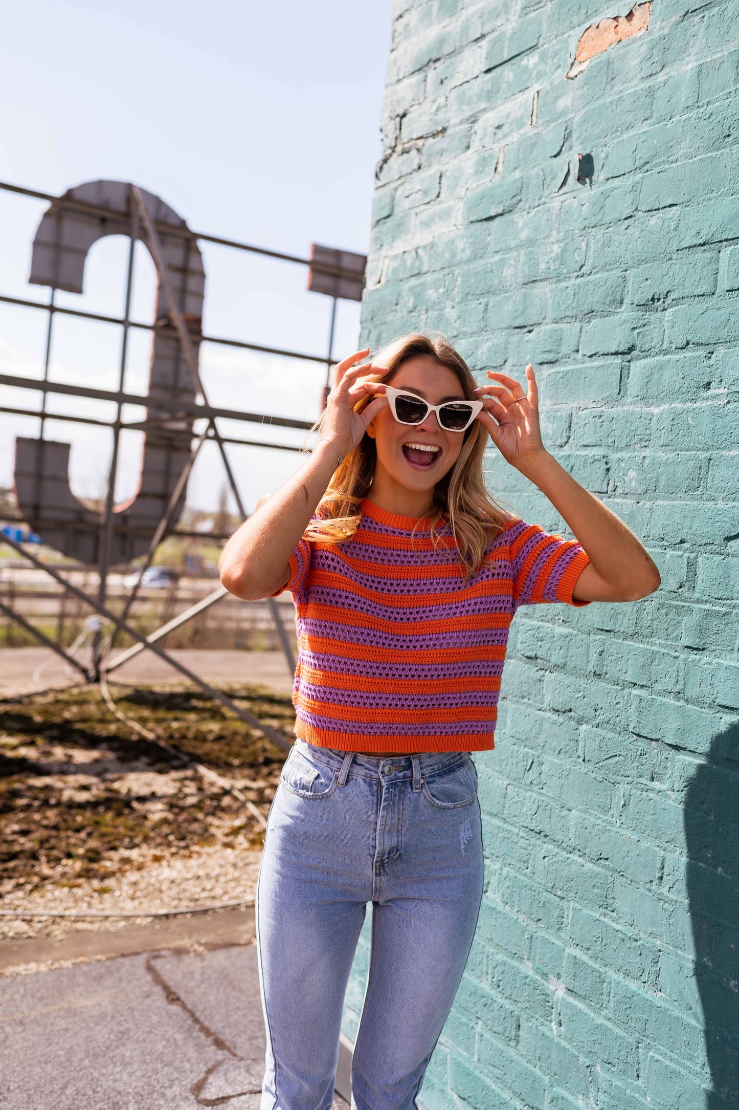 - Stunning crochet top is a vibrant mix of orange and purple, perfect for adding a pop of color to your outfit. It has short sleeves and a slightly cropped length, making it a great option for pairing with high-waisted bottoms. Perfect for spring/summer outfit!