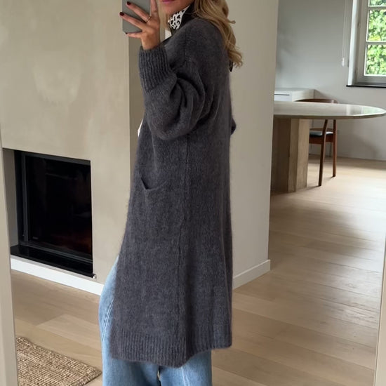 Soft, comfortable, and effortlessly stylish, the Grey Ally Cardigan is your go-to layering piece. Made in Italy, its longline design and long sleeves provide warmth, while practical side pockets add everyday functionality. Ideal for pairing with casual or polished looks, it’s a wardrobe essential for versatile style.