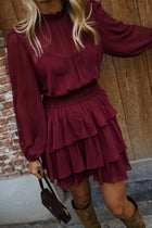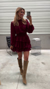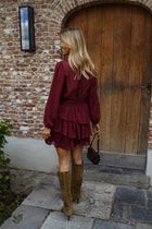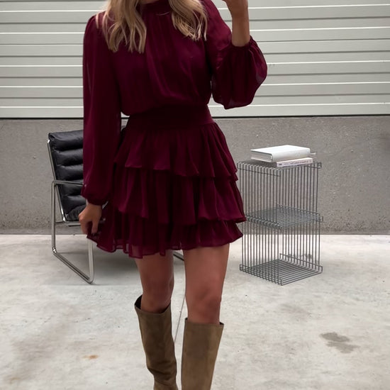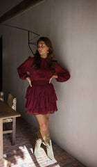 Romantic and refined, the Burgundy Indra Dress features a flowing silhouette with a ruffled hem and a slightly high collar. Its cinched waist flatters the figure, while the sheer back and teardrop opening add a delicate, alluring touch. Lined for comfort—except at the back—it’s the perfect balance of grace and sophistication.