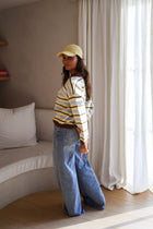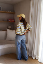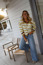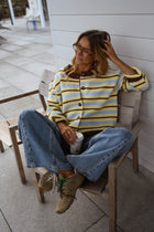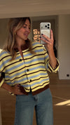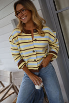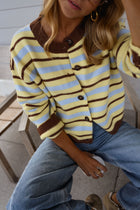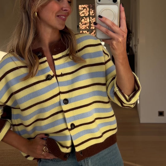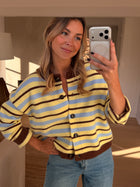 The Yellow Striped Bianca Cardigan is a playful, stylish essential for any wardrobe. Crafted from soft, comfortable fabric, it features long sleeves, vibrant blue and brown stripes, and a button-up silhouette for versatile styling. Effortlessly chic and cozy, this cardigan adds a cheerful, modern edge to your everyday looks.