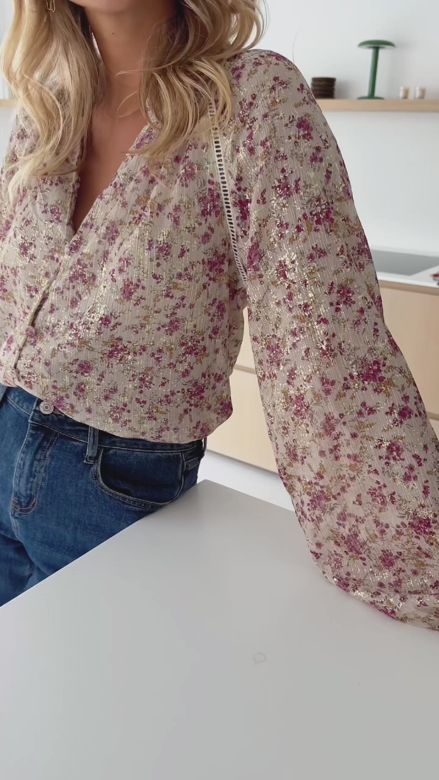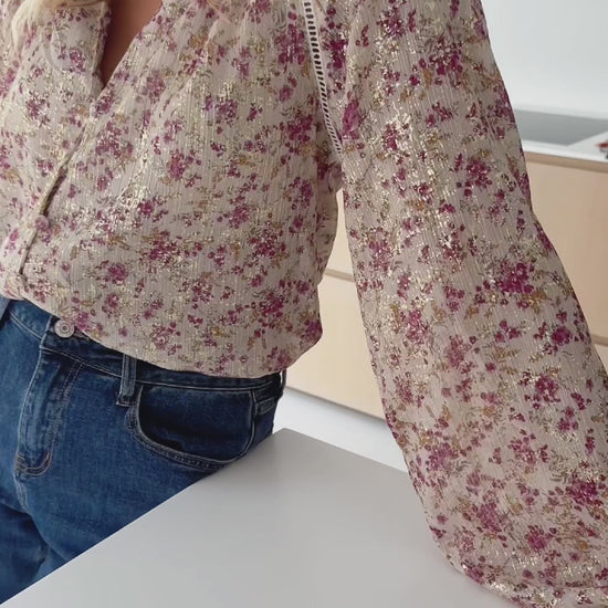 - Beige long sleeve blouse with beautiful floral patterns all over paired with a v-neckline. This blouse has a flowy, comfortable fit as well as elastic at the wrists, buttons up the front and a straight cut-structure. This blouse is perfect for dressing up or down and is the definition of versatile-chic!