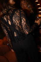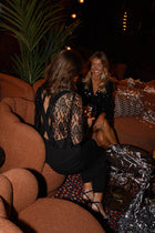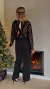 Meet the Black Isabelle Jumpsuit, a French-made piece that blends allure and refinement effortlessly. Its open-back design adds a dramatic touch, while the lace detailing on the bust brings softness and femininity. Finished with a tie at the back, a hidden zipper, and long sleeves, it’s a statement look made to stand out.