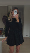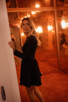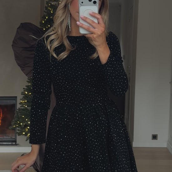 Meet your new go-to party piece: the Black Thelia Dress. This skater-style dress shines all over, bringing a subtle sparkle to every movement. Designed with long sleeves, a classic crew neck, and a slightly thick fabric, it offers both comfort and structure. The waist is gently tightened for a flattering silhouette, while the back zipper ensures easy dressing. Perfect for evenings out, celebrations, or any moment you want to feel confident and stylish.