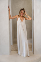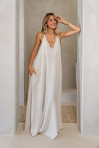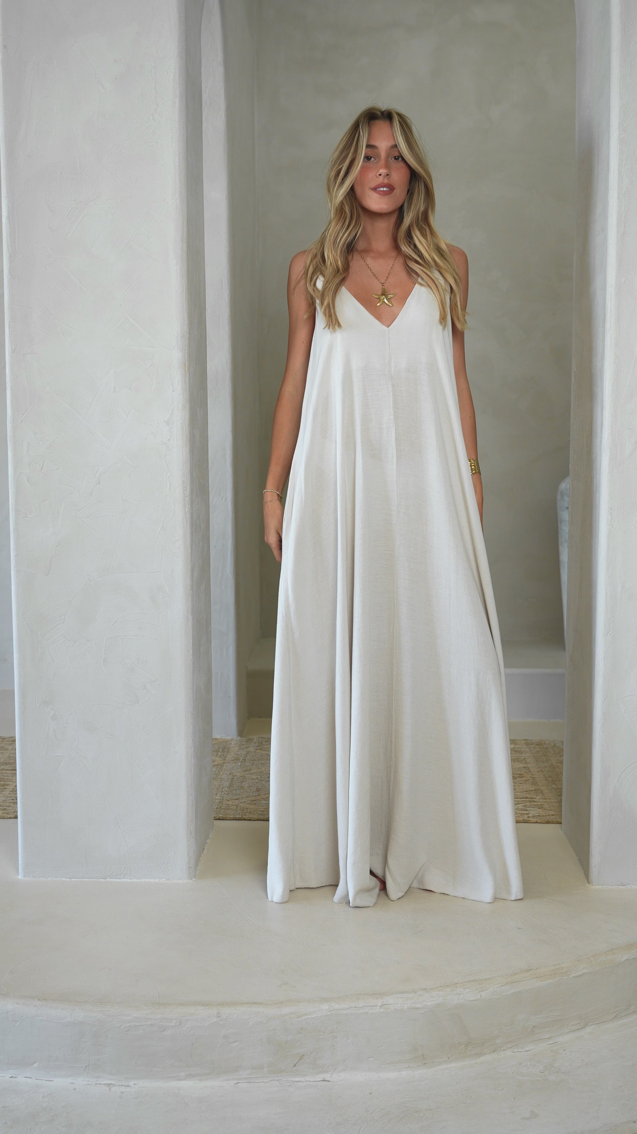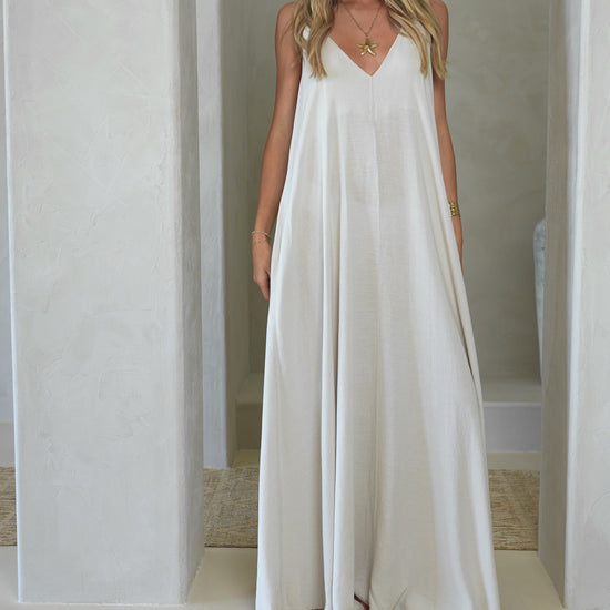 Effortless and chic, the Beige Lony Dress features a flattering V-neck and a fluid, loose fit that drapes beautifully. Crafted in soft linen with thin, non-adjustable straps and a V-shaped back neckline, it includes lining at the bust, side pockets, and a fully opaque design—perfect for sunny days or relaxed outings.