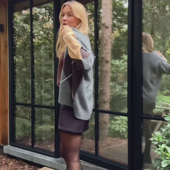 Add a cozy, patterned touch to your wardrobe with the Grey Checkered Georgia Cardigan. Featuring long sleeves, button plackets, and a mix of beige, brown, and ecru jacquard patterns, this slightly loose cardigan combines classic charm with effortless style.