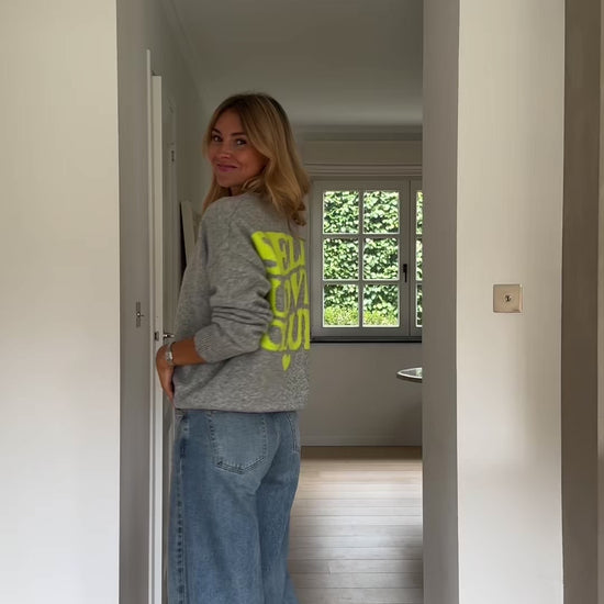 Add a fun twist to your wardrobe with the Beige Milene Cardigan. Featuring a round neck and long sleeves, this slightly loose piece ensures comfort and style. The neon yellow “Self Love Club” logo on the back brings a playful and positive touch to this cozy essential.