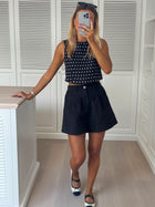 Turn heads in the Black Polka Dots Pietra Top, a playful favorite with an adjustable tie front and flirty open back. Slightly cropped and crafted in a lightly crinkled fabric, its black-and-ecru polka dot pattern adds timeless charm. Unlined and breezy, this short top is perfect for effortless day-to-night styling with a touch of whimsy.