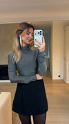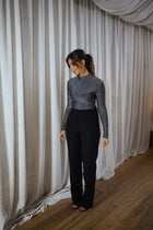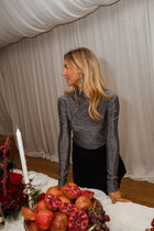 Shine with subtle elegance in the Silver Eva Blouse. Featuring a mock-neck collar, long sleeves, and soft, shimmering fabric, its form-fitting silhouette creates a polished, modern look that’s perfect for any occasion.