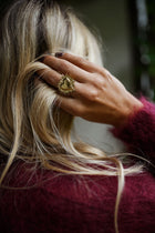 The Golden Hara Ring radiates bold charm with its sculpted heart centerpiece and sunburst detailing. Crafted from stainless steel with a golden finish, it’s a statement piece that shines with confidence and individuality.