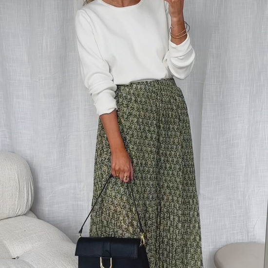 - Green maxi skirt features a pleated effect in the fabric, which creates a beautiful flowy look. The skirt is also lined and has golden lurex in the pattern, giving it a touch of luxury and sparkle. It has an elastic waist for a comfortable fit, making it a versatile and practical addition to any wardrobe.