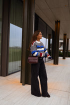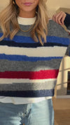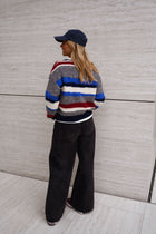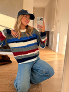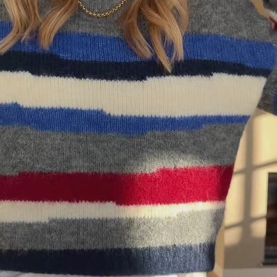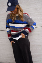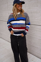 The Grey Striped Eilis Sweater brings cozy comfort and a splash of color to everyday wear. Designed with a classic round neck and long sleeves, it features soft fabric that feels gentle against the skin. Bold stripes in blue, ecru, and burgundy add playful contrast, making this sweater a versatile piece for casual or layered looks.
