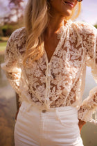 Light and effortlessly chic, the Ecru Dalia Blouse brings a delicate touch to your wardrobe. Designed with a flattering v-neckline, classic button front, and airy long sleeves, it features a subtle floral design that enhances its feminine charm. The semi-sheer fabric adds a hint of allure while remaining elegant—perfect for layering or making a soft statement on its own.