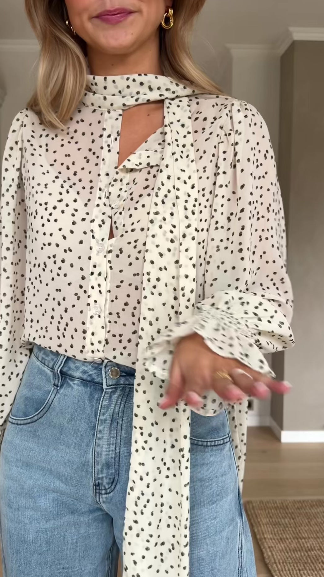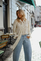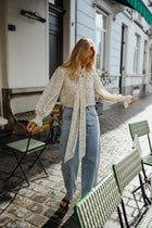 Softly romantic with a fluid silhouette, the Ecru Polka Dot Clarissa Blouse is defined by its elegant neck-bow collar and delicate polka dot pattern. The lightweight, slightly sheer fabric drapes effortlessly, creating a graceful movement with every step. Long sleeves with elasticated cuffs add gentle volume, giving the Ecru Polka Dot Clarissa Blouse a refined yet easygoing charm.
