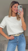 - White crewneck t-shirt that is curated from a thick-cotton fabric that features dainty embroidery detailing on the collar and sleeves making this the perfect spring-summer tee!