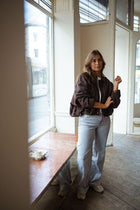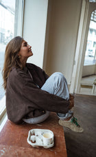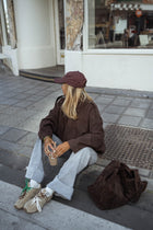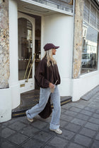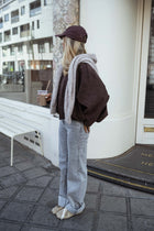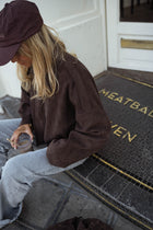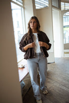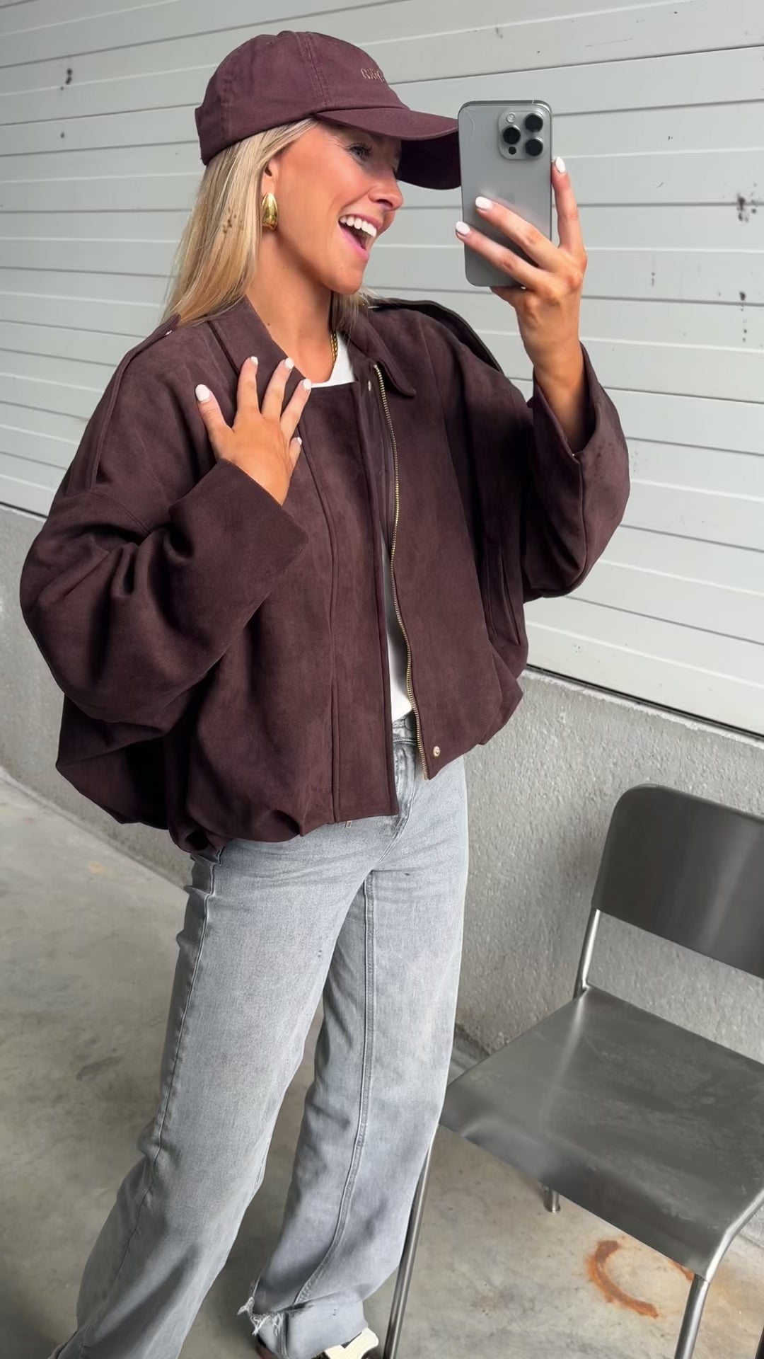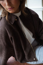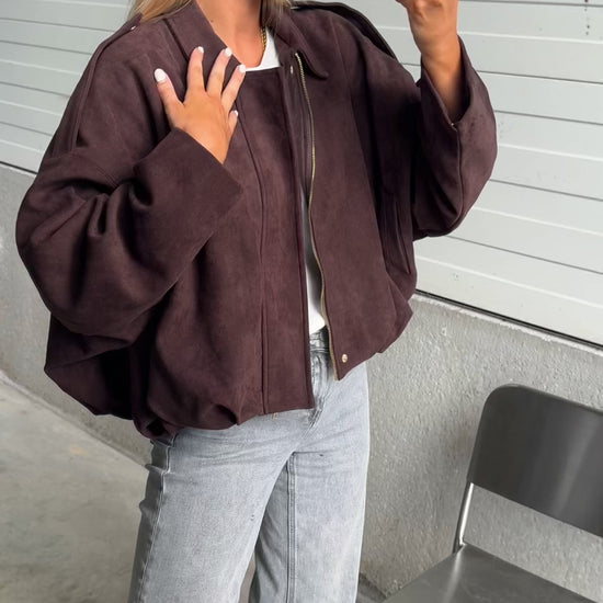 Elevate your outerwear with the Chocolate Dave Jacket. Crafted from faux suede, it features a unique gathered hem, slightly puffed long sleeves, a gold zipper, and side pockets for practicality. Its slightly oversized fit combines comfort with modern appeal, making it perfect for layering over any outfit.