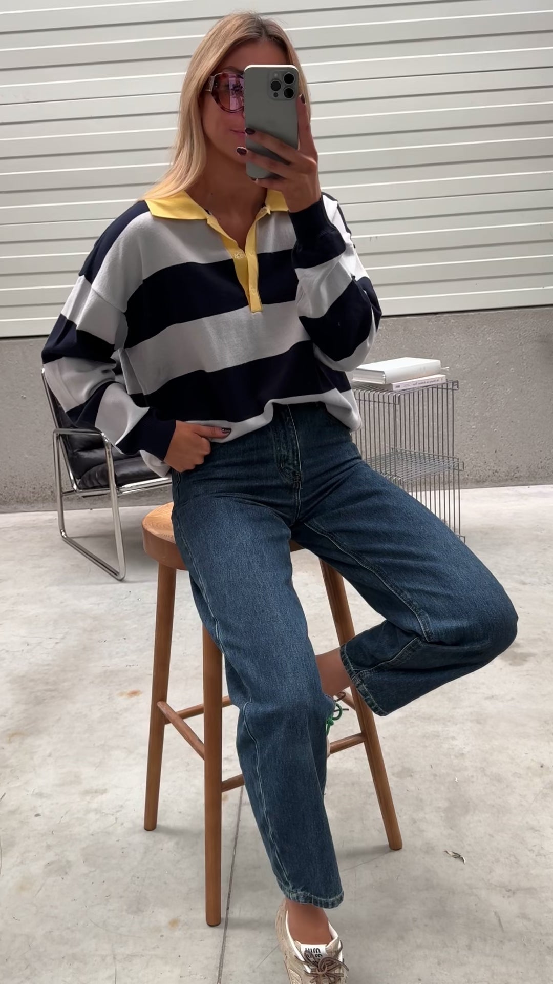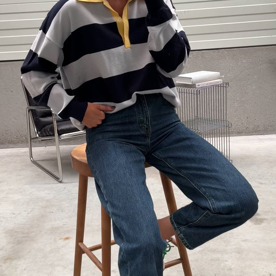Step up your casual style with the Grey and Blue Striped Davis Polo Sweater. Featuring a yellow polo-style collar and blue-and-grey stripes, this slightly loose, long-sleeved knit blends comfort with a pop of color for an effortlessly cool look.