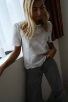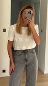Delicate and detailed, the Ecru Noemi Blouse stands out with all-over embroidery that makes each piece unique. Designed with short sleeves and a round neckline, it offers a feminine, artisanal touch perfect for warm days and effortless styling.