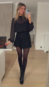 - The Black Idea Blouse is the epitome of understated elegance. With its long sleeves and slightly mock-neck, it offers a flowy and sophisticated silhouette. The chest is lined for comfort, while the sheer sleeves and back lend a delicate, alluring touch. Perfect for pairing with tailored pants or skirts, this blouse transitions effortlessly from day to night with timeless charm.