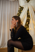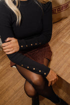 The Black Laly Sweater offers a sleek, timeless look with its crew neck and long sleeves. Slightly fitted for a flattering silhouette, it is refined with gold snap buttons on the cuffs, adding a subtle touch of elegance to any outfit.