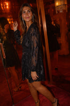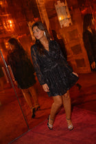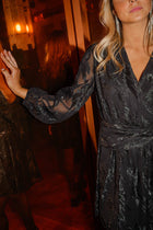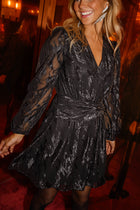 The Black Laureen Dress is a wrap-style design enhanced with sparkling patterns that catch the light beautifully. Its fluid silhouette drapes effortlessly, while the fabric cinches naturally at the waist for a flattering shape. The dress is lined for comfort, with unlined sleeves and a sheer back that keep the look light and airy. Elasticated cuffs complete the style with a soft, refined finish.