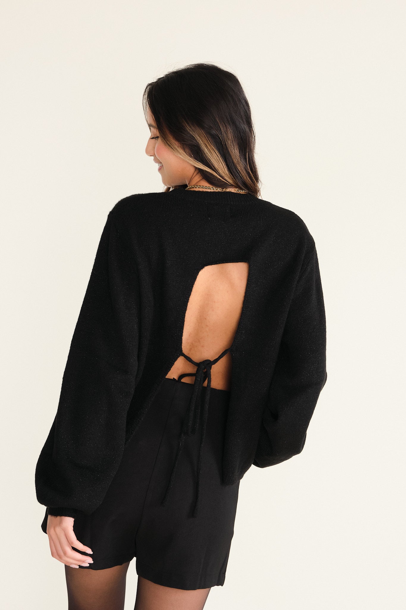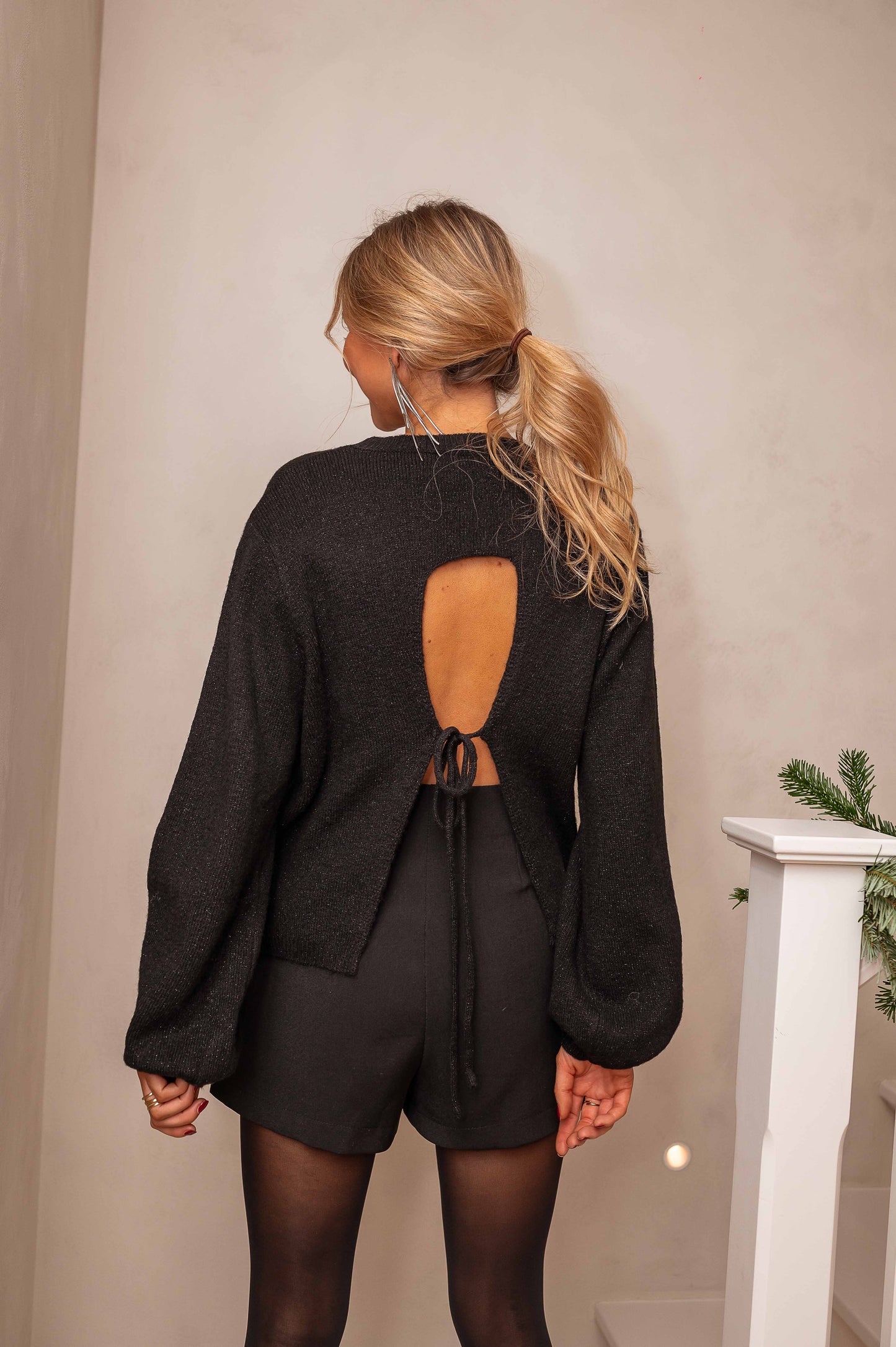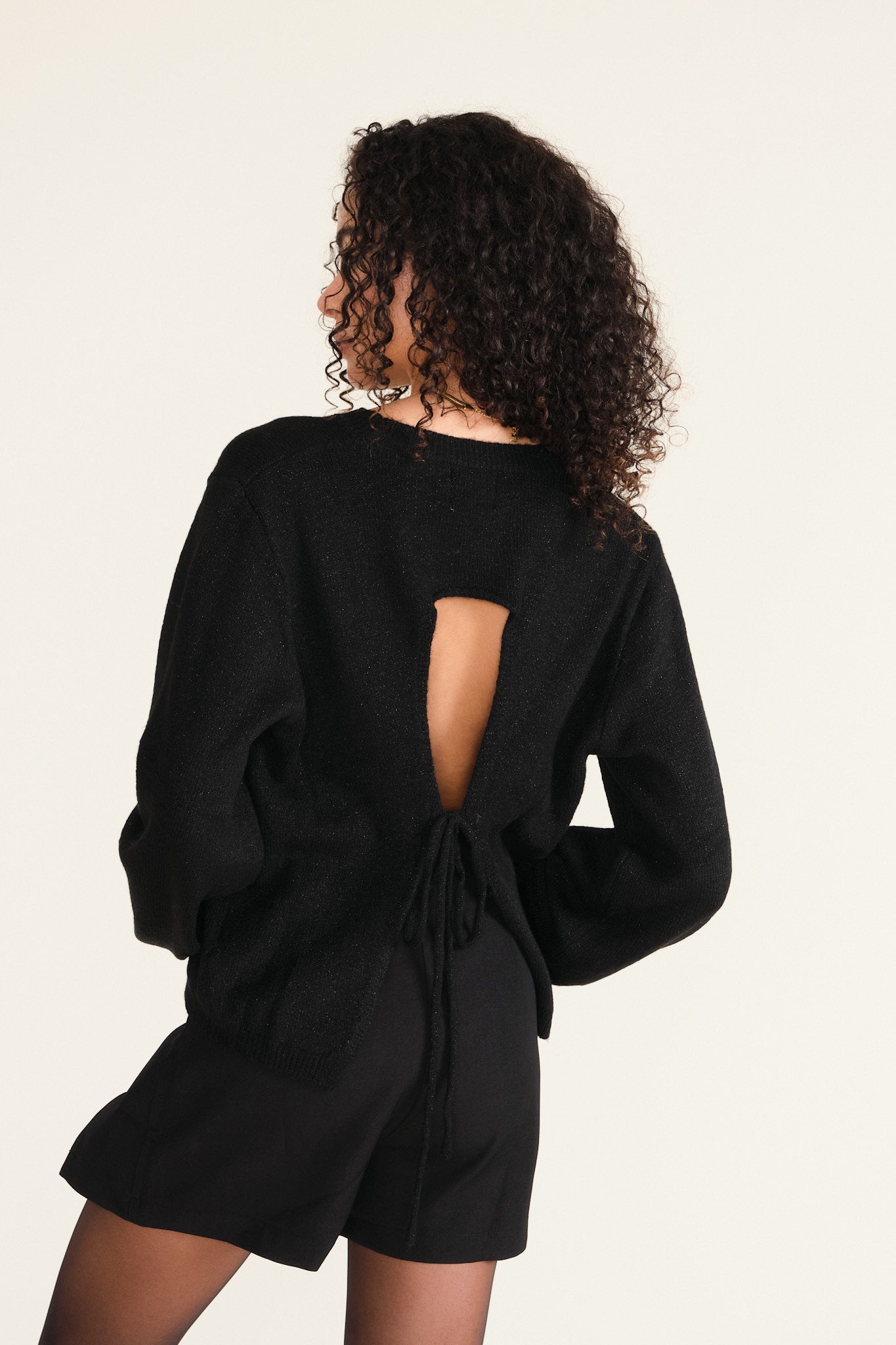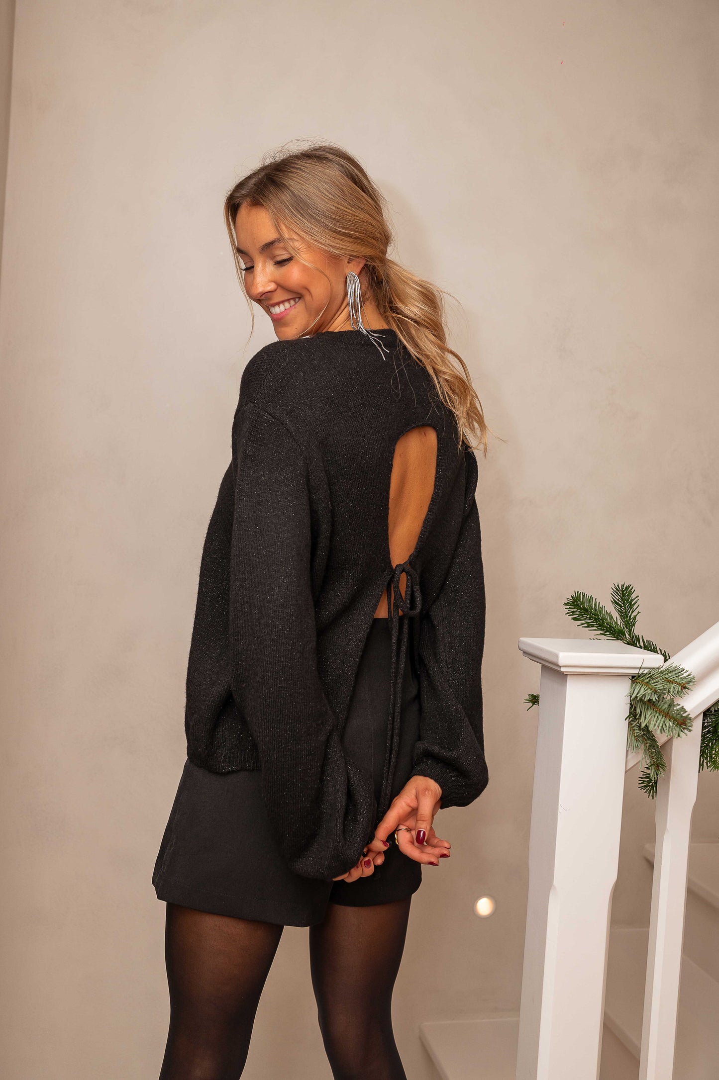 - Add a touch of sparkle to your wardrobe with the Black Mika Sweater. Featuring a slightly glittery finish, an open back, and a classic crewneck, this sweater combines elegance with a modern twist. Perfect for both casual and dressy looks.