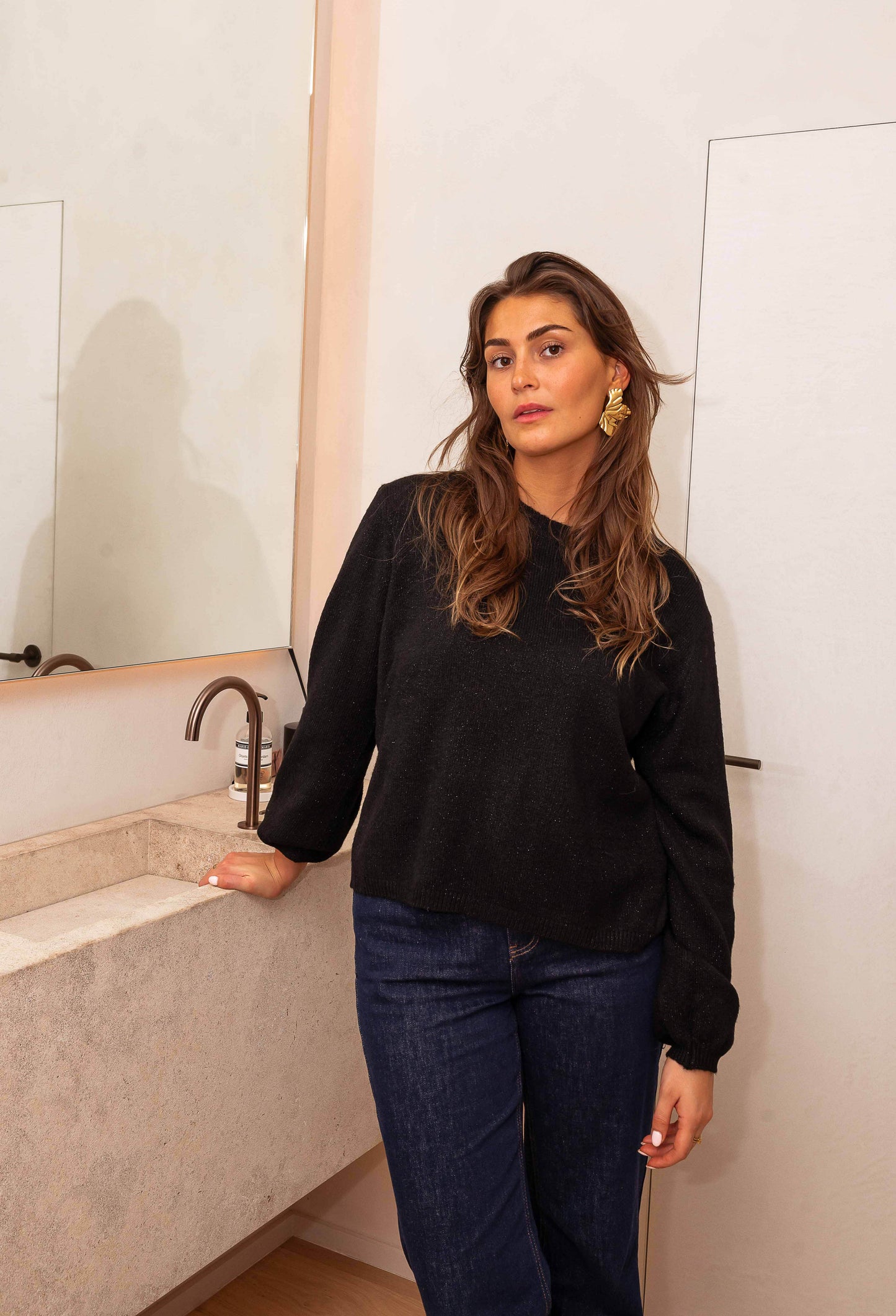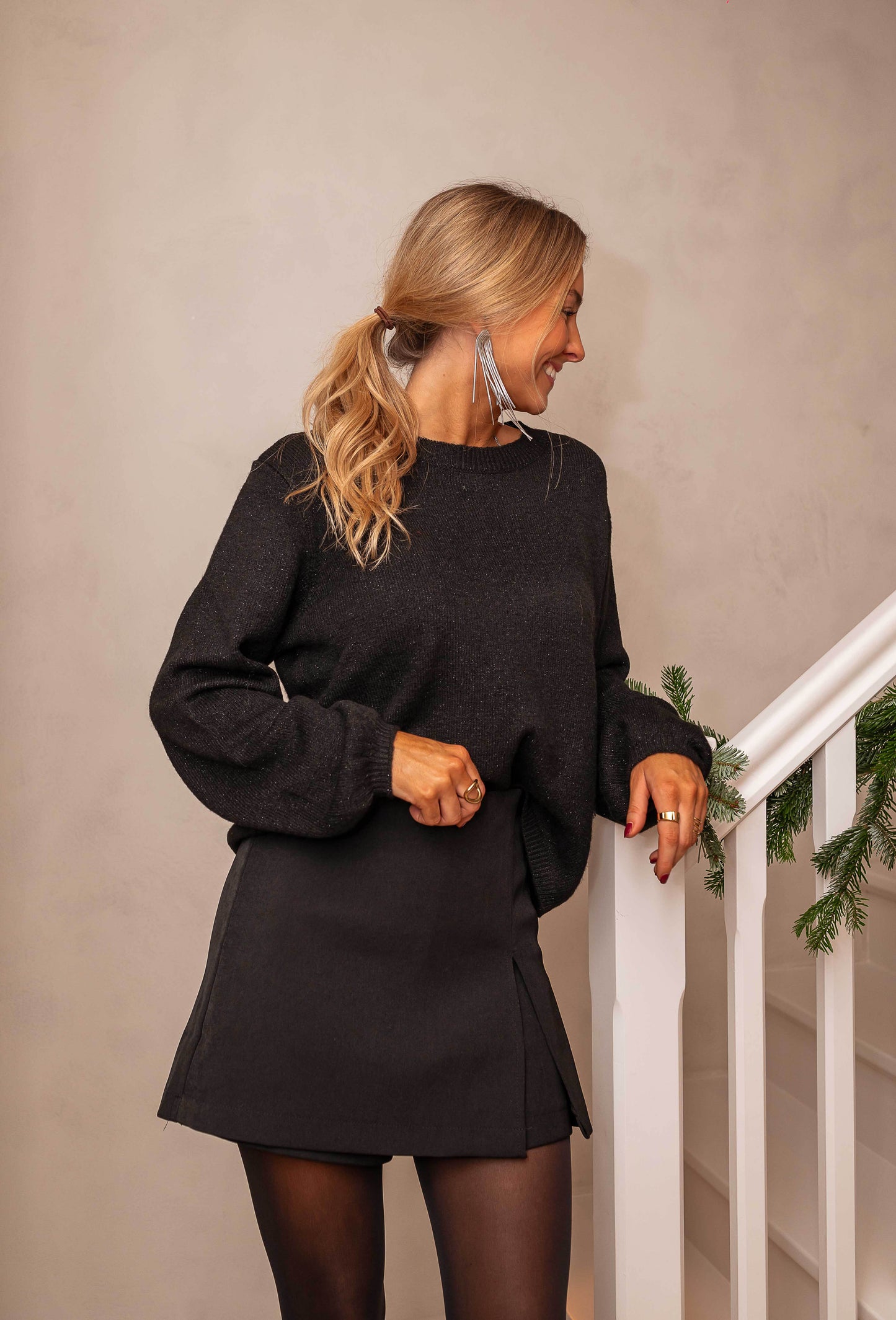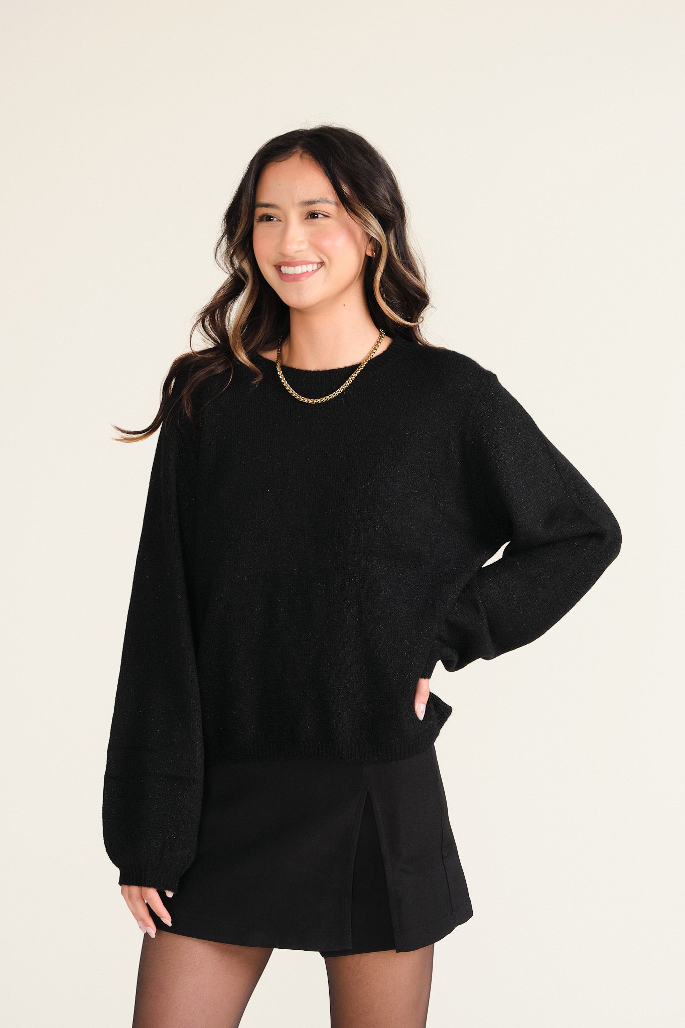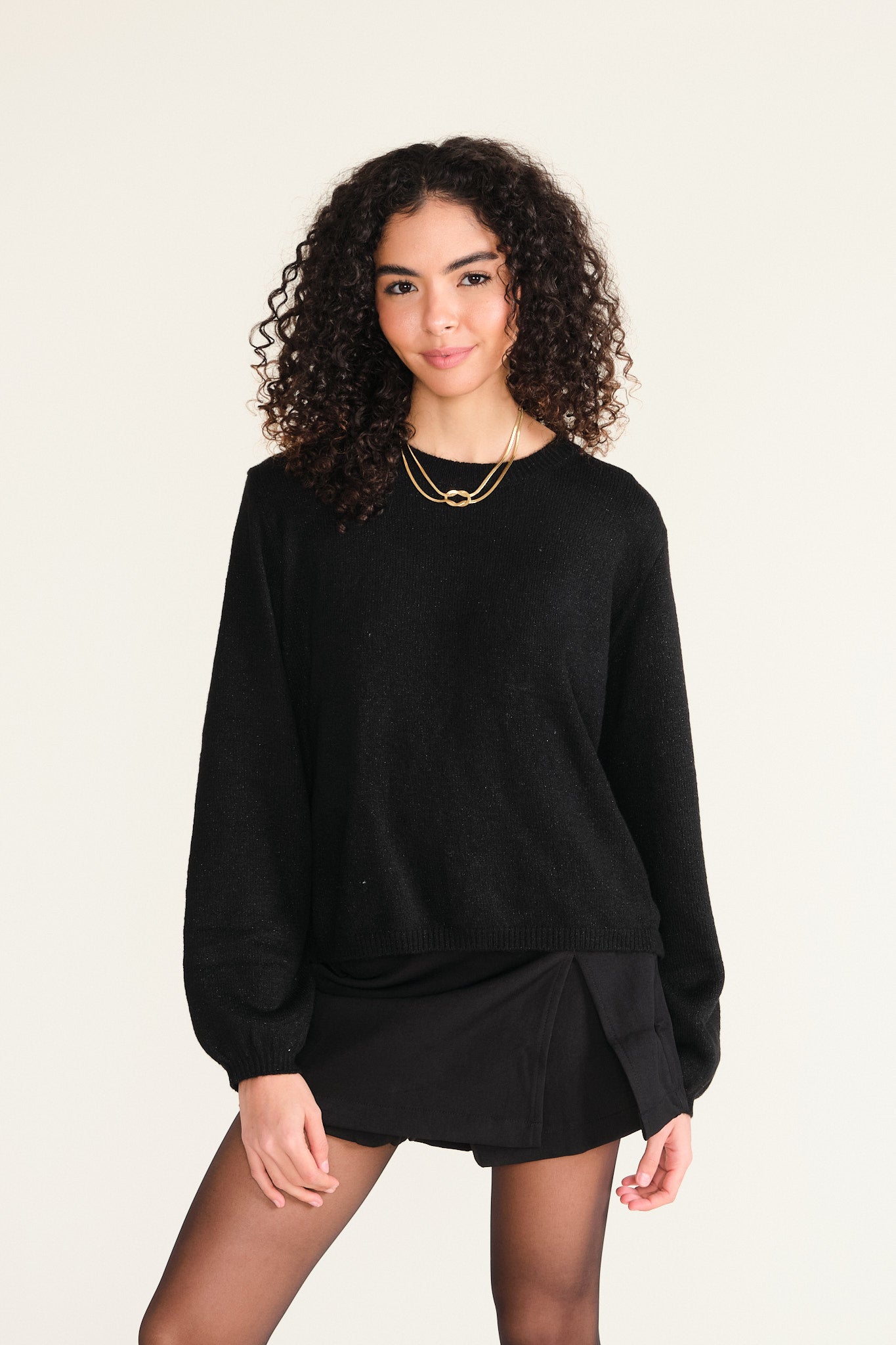 - Add a touch of sparkle to your wardrobe with the Black Mika Sweater. Featuring a slightly glittery finish, an open back, and a classic crewneck, this sweater combines elegance with a modern twist. Perfect for both casual and dressy looks.