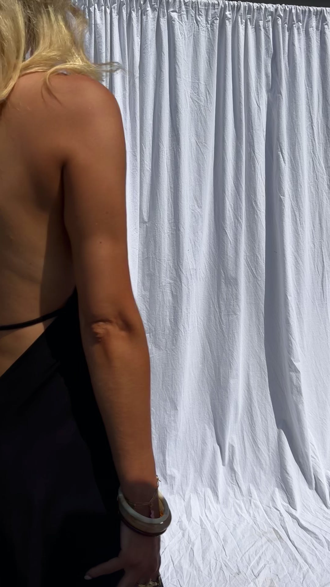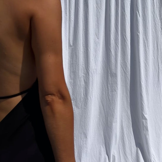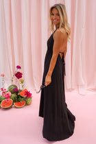 Chic and lightweight, the Black Salia Dress features a flowy maxi silhouette with a flattering V-neck and adjustable ties at the neck and back. Unlined yet non-transparent, it's perfect for warm-weather elegance.