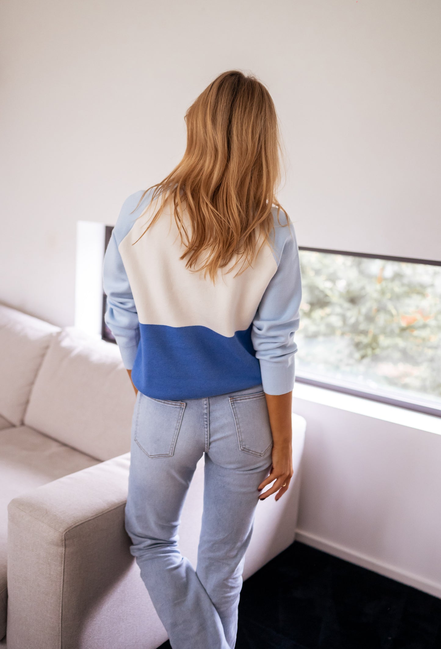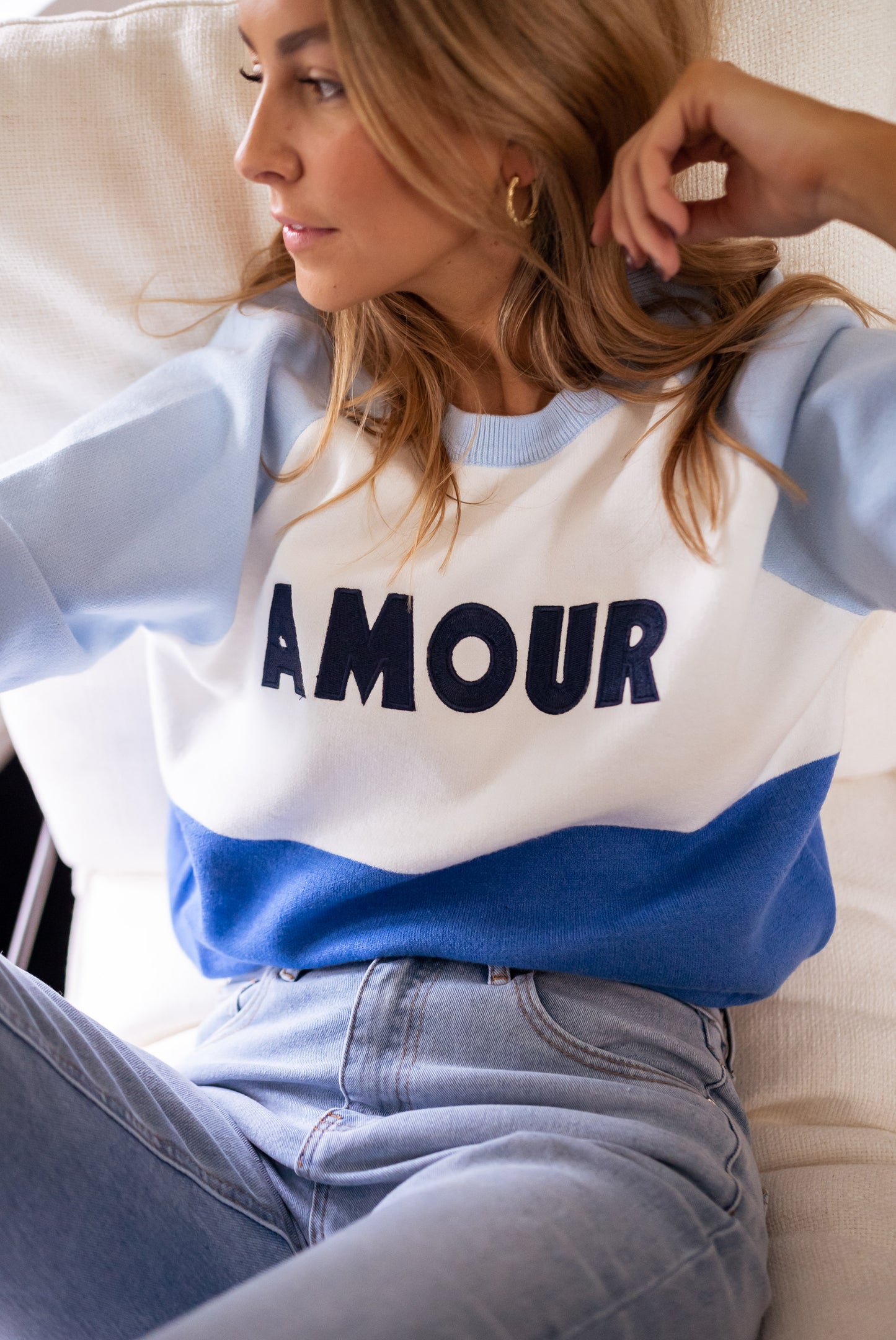 - Stay cozy in style with our multi-shade blue and ecru crewneck sweater featuring a chic 'AMOUR' logo.