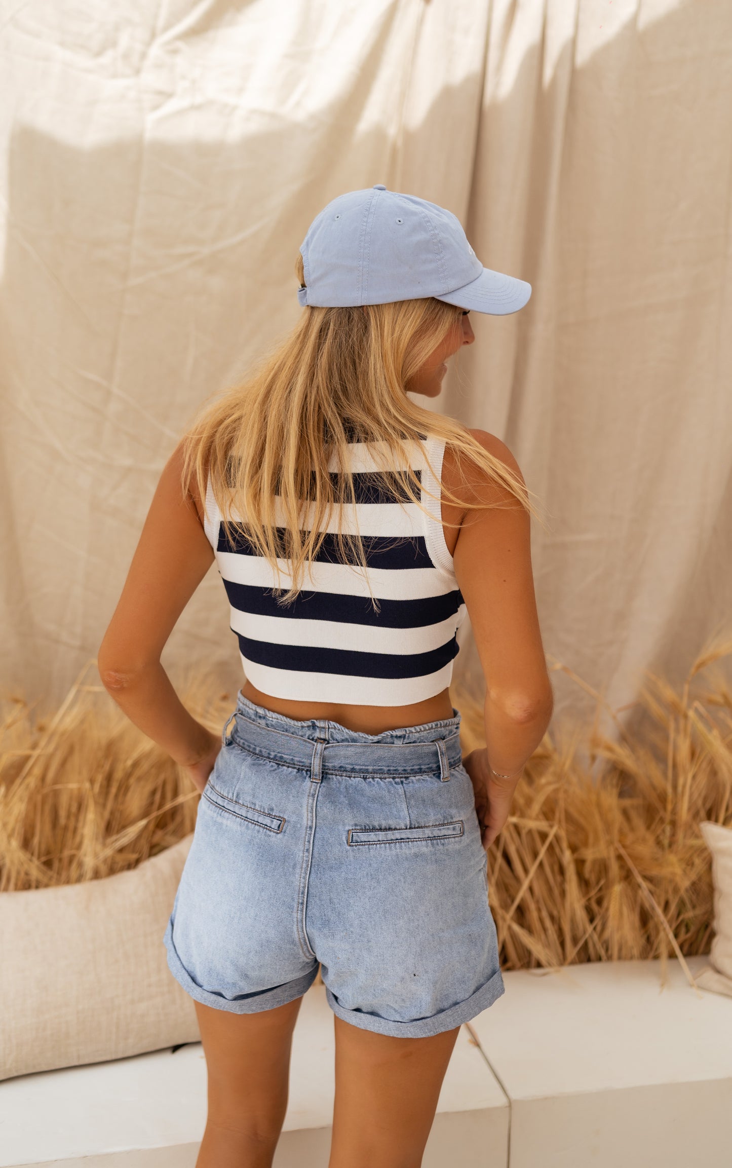 - Stunning striped crop top, designed to be form-fitting, accentuating your figure with style. With short sleeves and a trendy appeal, it pairs perfectly with our denim Dani shorts, as showcased by our model. This fashion-forward piece adds a touch of flair to any outfit!