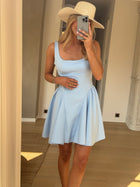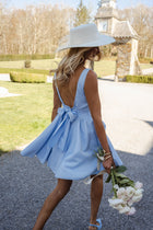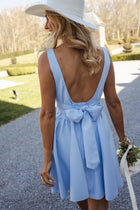 Elegant with a touch of charm, the Blue Maela Dress stands out with its structured square neckline and open back finished with a soft bow. Designed with a snug fit at the waist and bust, it highlights your shape while staying comfortable. The fabric is unlined yet fully opaque, offering confident wear all day and night.