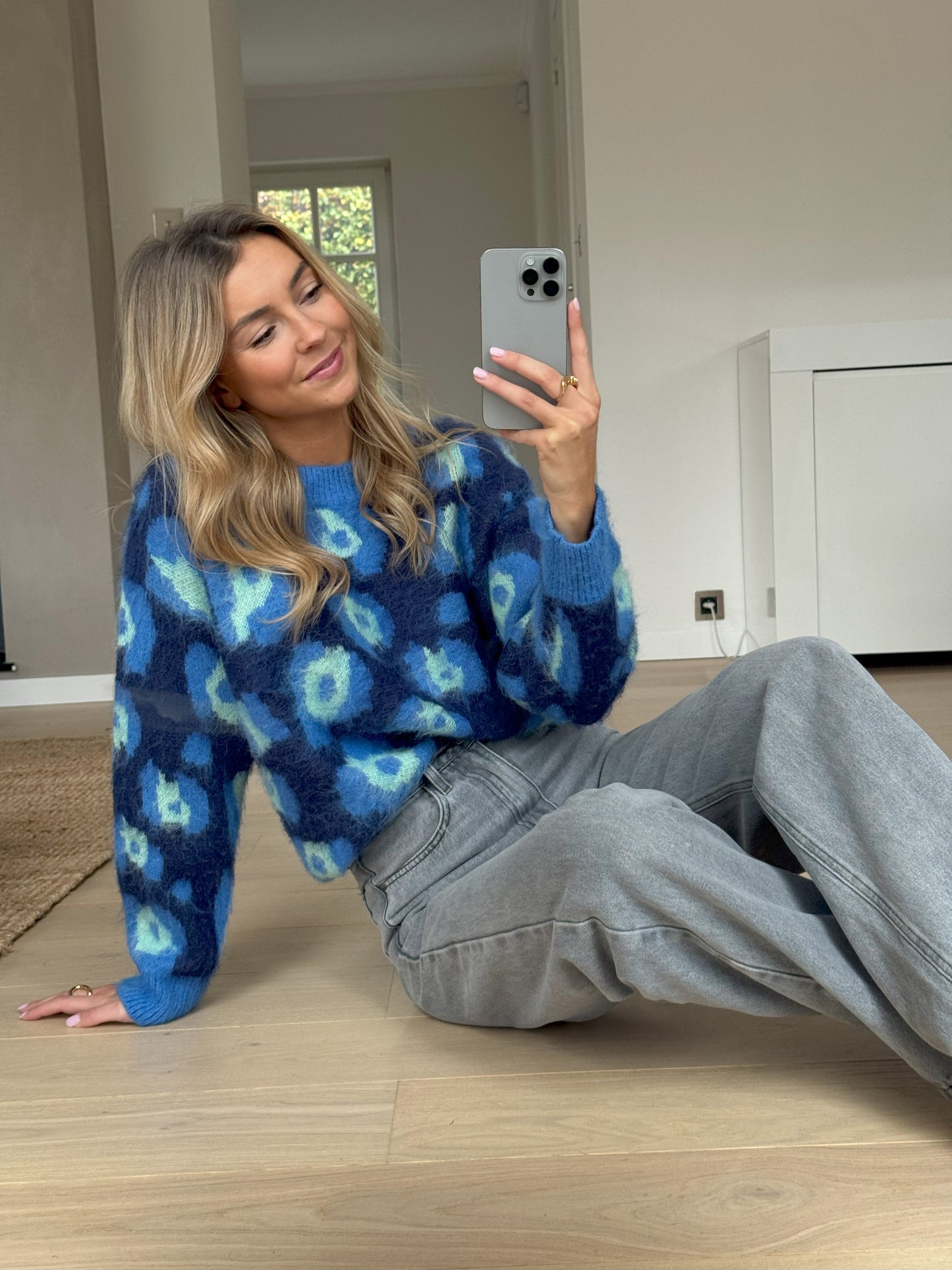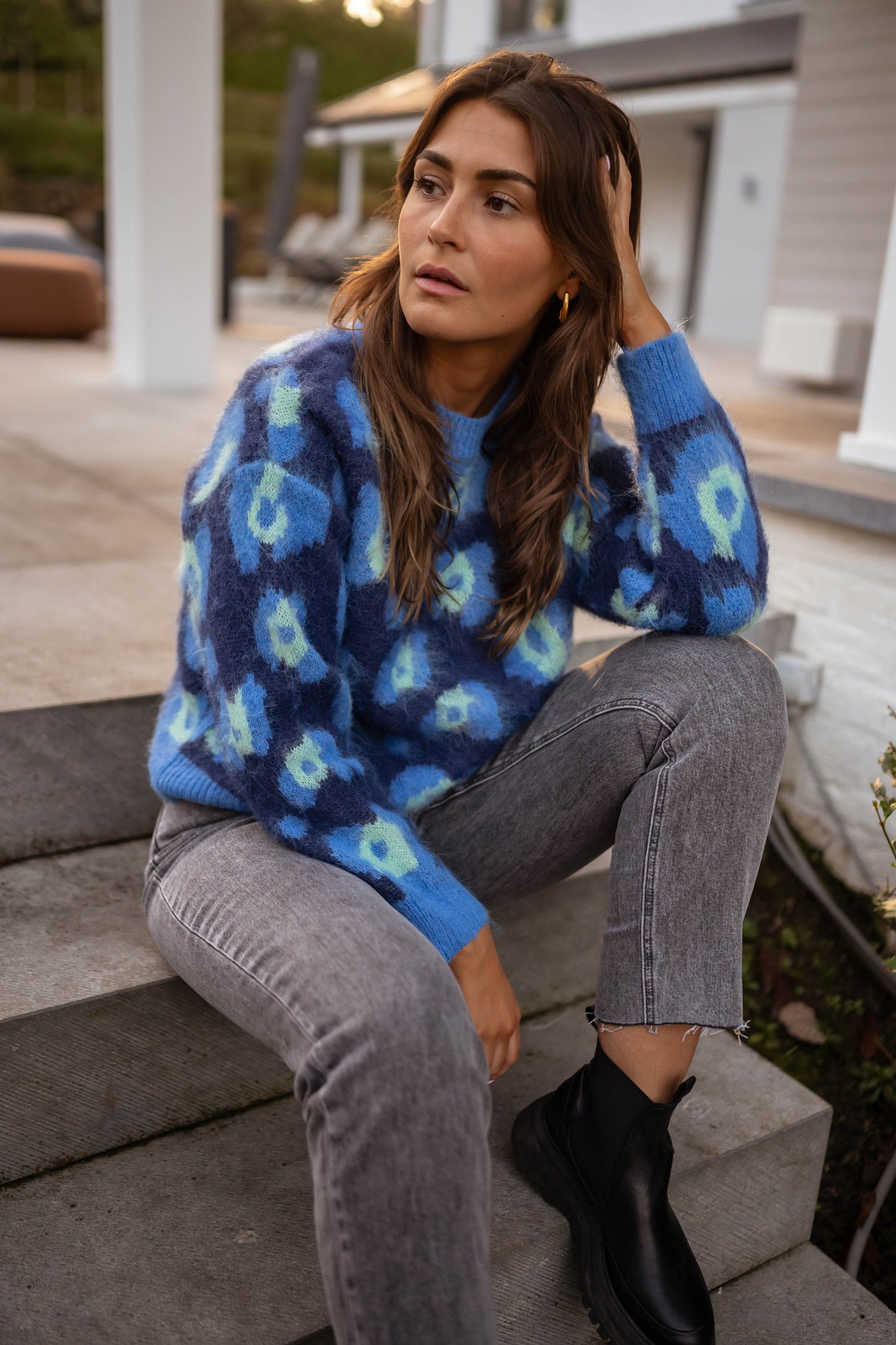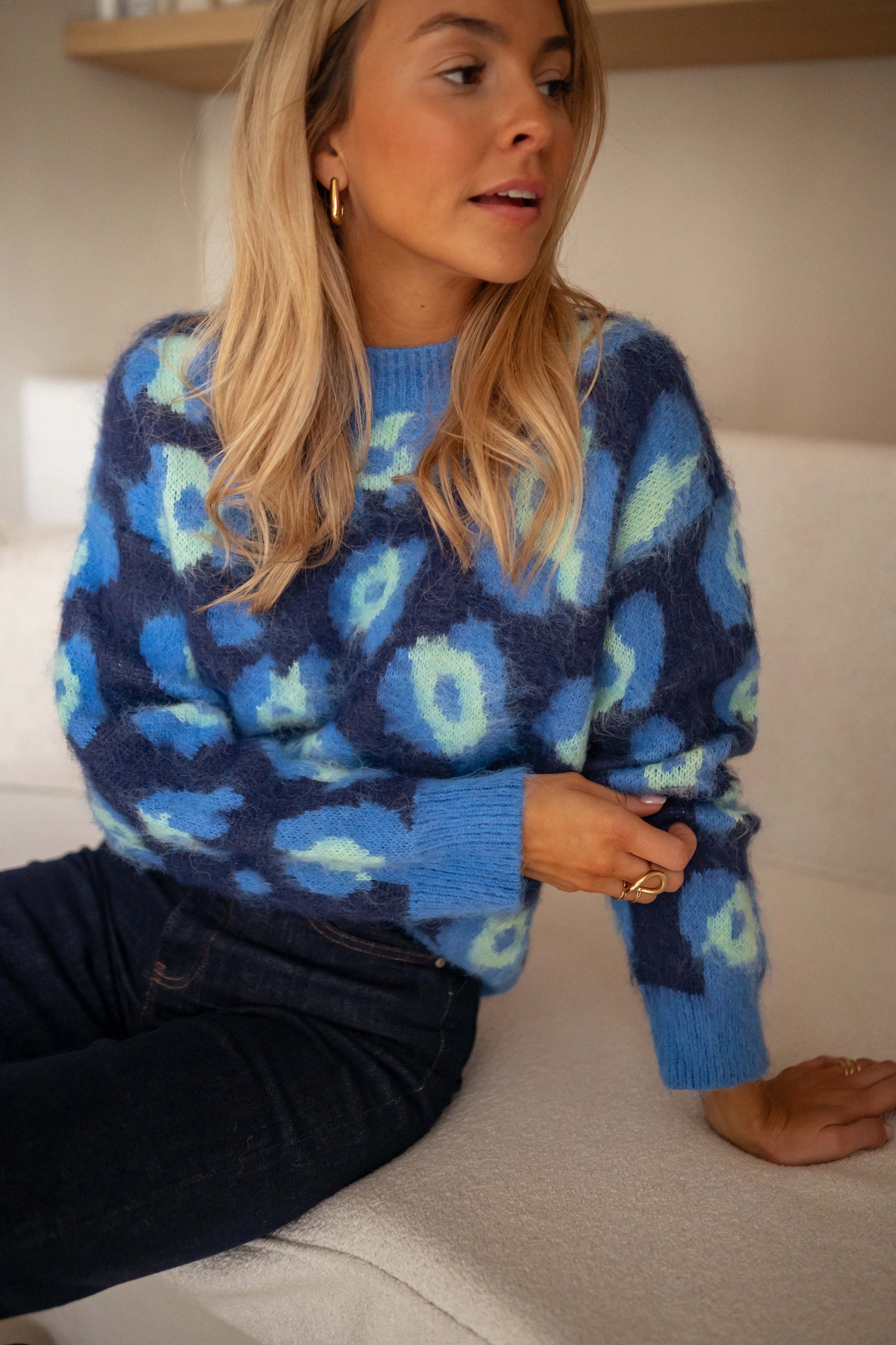 • Embrace cozy chic with the Blue Pepa Sweater. Featuring a stylish leopard pattern, long sleeves, and a classic crewneck, this soft sweater is the perfect combination of warmth and bold fashion. Whether layered or worn solo, it's a versatile addition to any wardrobe.