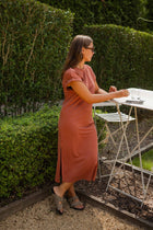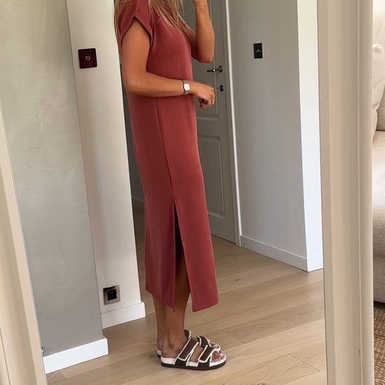 The Brick Lyana Dress blends casual charm with comfort. Made from a soft, non-transparent fabric, it features a round neck and twin slits at the hem. Its fluid shape makes it perfect for laid-back days.