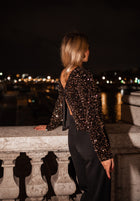 - Bronze sequin long sleeve, velvet blouse that features a slight open back detailing that is paired with two buttons to attach on the back. This blouse is slightly cropped, offers lining, as well as a crew-neckline.