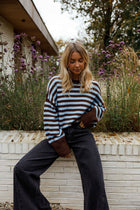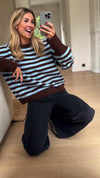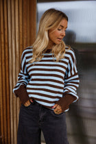 Effortlessly stylish, this striped sweater combines rich brown and blue tones in a relaxed silhouette that flatters every frame. The round neckline and extended sleeves deliver timeless appeal, while the gently oversized fit ensures all-day comfort without sacrificing sophistication. Perfect for layering or wearing solo, the Emilie Sweater transitions seamlessly from casual weekends to polished weekday looks.