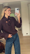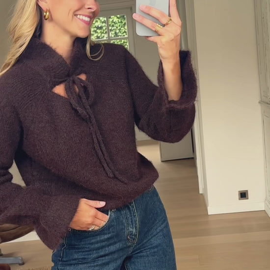Turn everyday style into effortless charm with the Brown Harper Sweater. Its soft fabric, high collar with a delicate tie, and flared cuffs add playful elegance, making it the perfect piece to elevate any outfit.