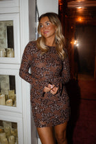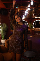 Step into the spotlight with the Brown Inola Dress. Fully embellished with sequins, it catches every glimmer of light, while the crew neck and long sleeves with subtle flare at the wrists add refined elegance. Slightly form-fitting and lined for comfort, this dress is perfect for glamorous evenings or standout special occasions.