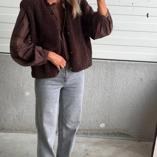 Stay cozy and stylish with the Brown Taoh Vest. Crafted in a shearling-effect fabric, this sleeveless vest features a relaxed fit and front pockets for both comfort and practicality. Perfect for layering over sweaters or long-sleeve tops, it adds warmth and texture to any outfit.
