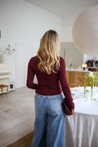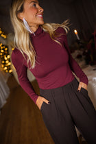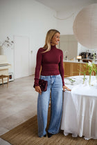 Sleek and versatile, the Burgundy Rowa Sweater features a classic turtleneck and long sleeves in a thin, soft material. Its tight-fitting silhouette hugs the body for a chic, streamlined look that’s perfect for layering or wearing on its own.