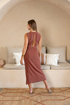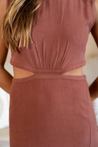 Turn heads in the Chocolate Aubry Dress, featuring a slightly high neckline and sleek back zipper for a polished fit. With daring side cut-outs, a side slit, and an unlined, fully opaque design, this dress combines elegance with a subtle, modern edge—perfect for evening outings or special occasions.