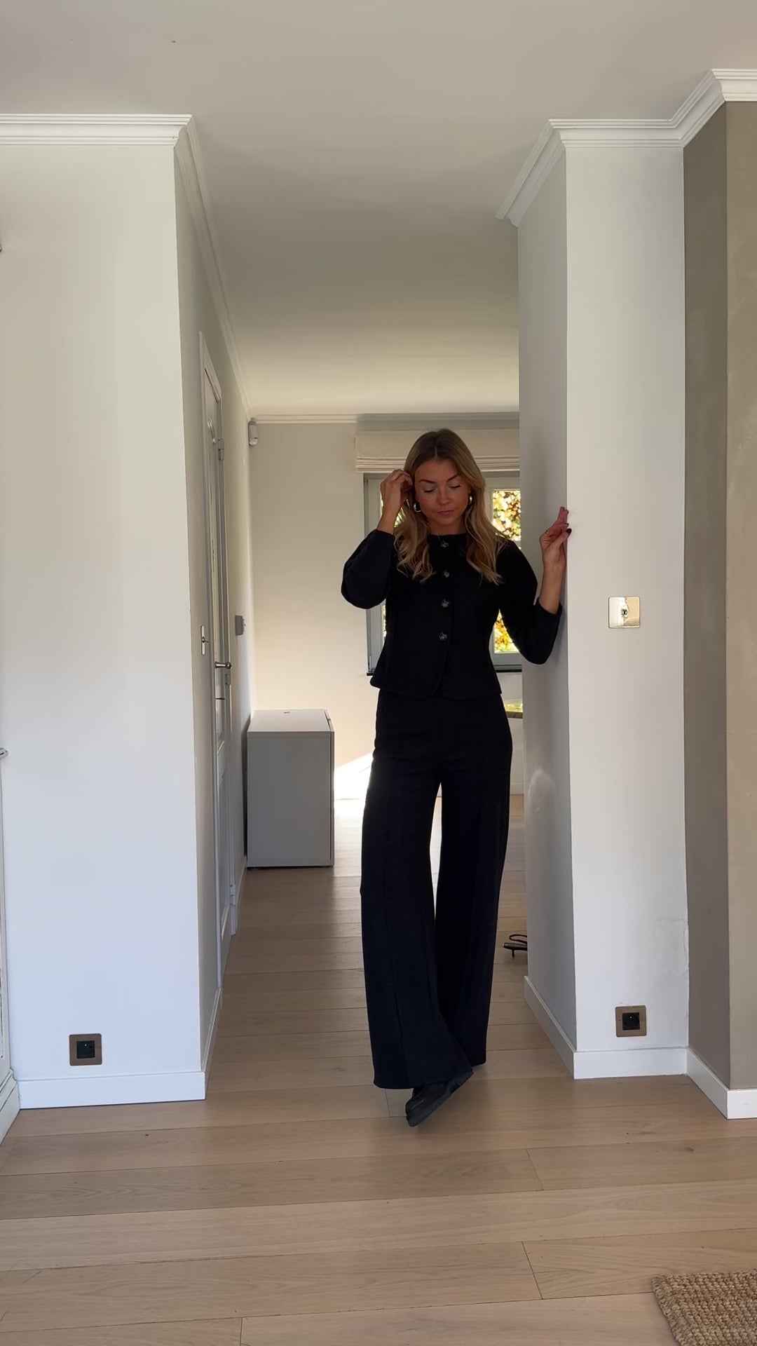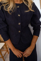 Designed for comfort without compromising style, the Dark Grey Henny Set is crafted from soft, comfortable fabric with a subtle heathered effect. The slightly cropped top features a button-up silhouette, 7/8 sleeves, and structured epaulettes. The matching trousers are finished with an elastic waistband and a slightly flared cut at the bottom, creating a relaxed yet polished silhouette perfect for everyday wear.